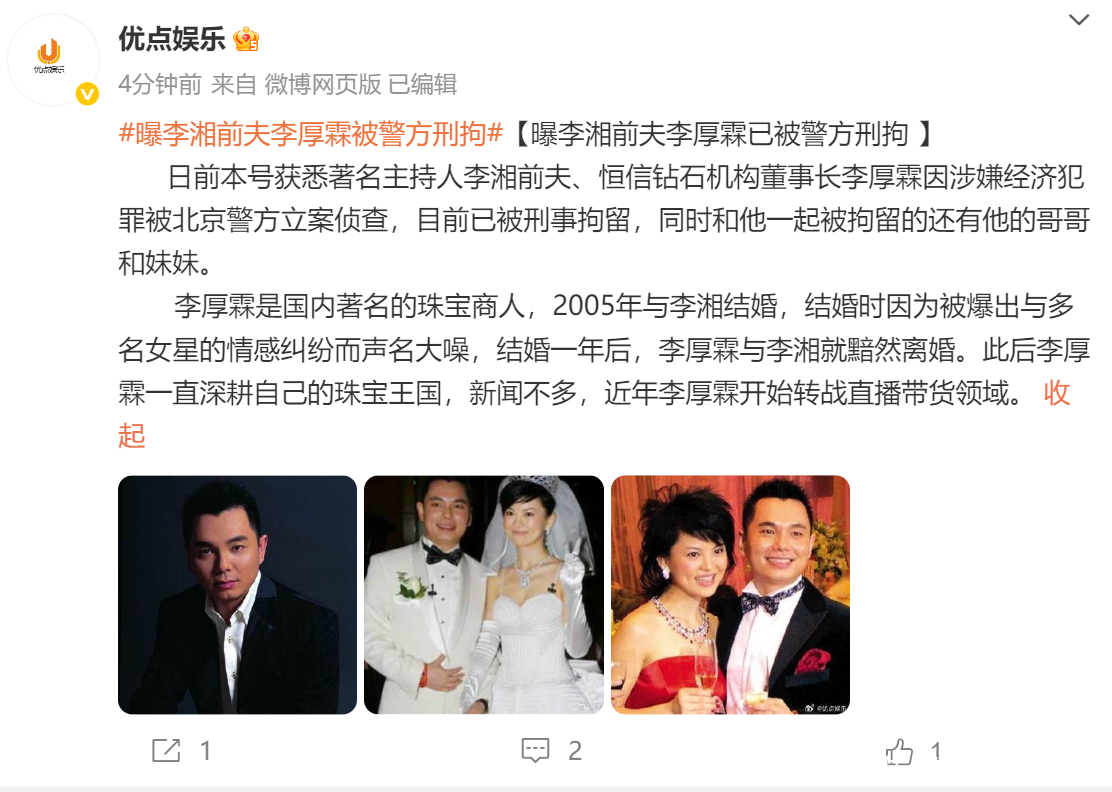 娱乐圈又曝瓜了!12月18日,有娱乐博主爆料,李湘的前夫、恒信钻石机构董事长李厚霖因涉嫌经济犯罪被北京警方立案侦查,目前已被刑事拘留,同时和他一起被拘留的还有他的哥哥和妹妹。